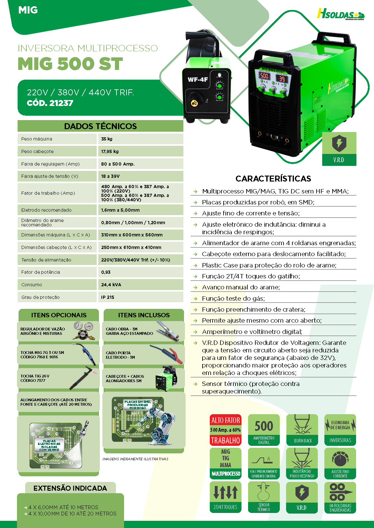 • V.R.D Dispositivo Redutor de Voltagem: Garante que a tensão em circuito aberto seja reduzida para um fator de segurança (abaixo de 32V), proporcionando maior proteção aos operadores em relação a choques elétricos;